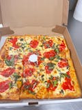 Square pizza with fresh tomato, basil, oregano & garlic.