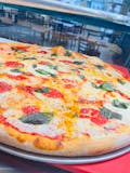 Classic Margherita pizza with tomato, mozzarella, basil.